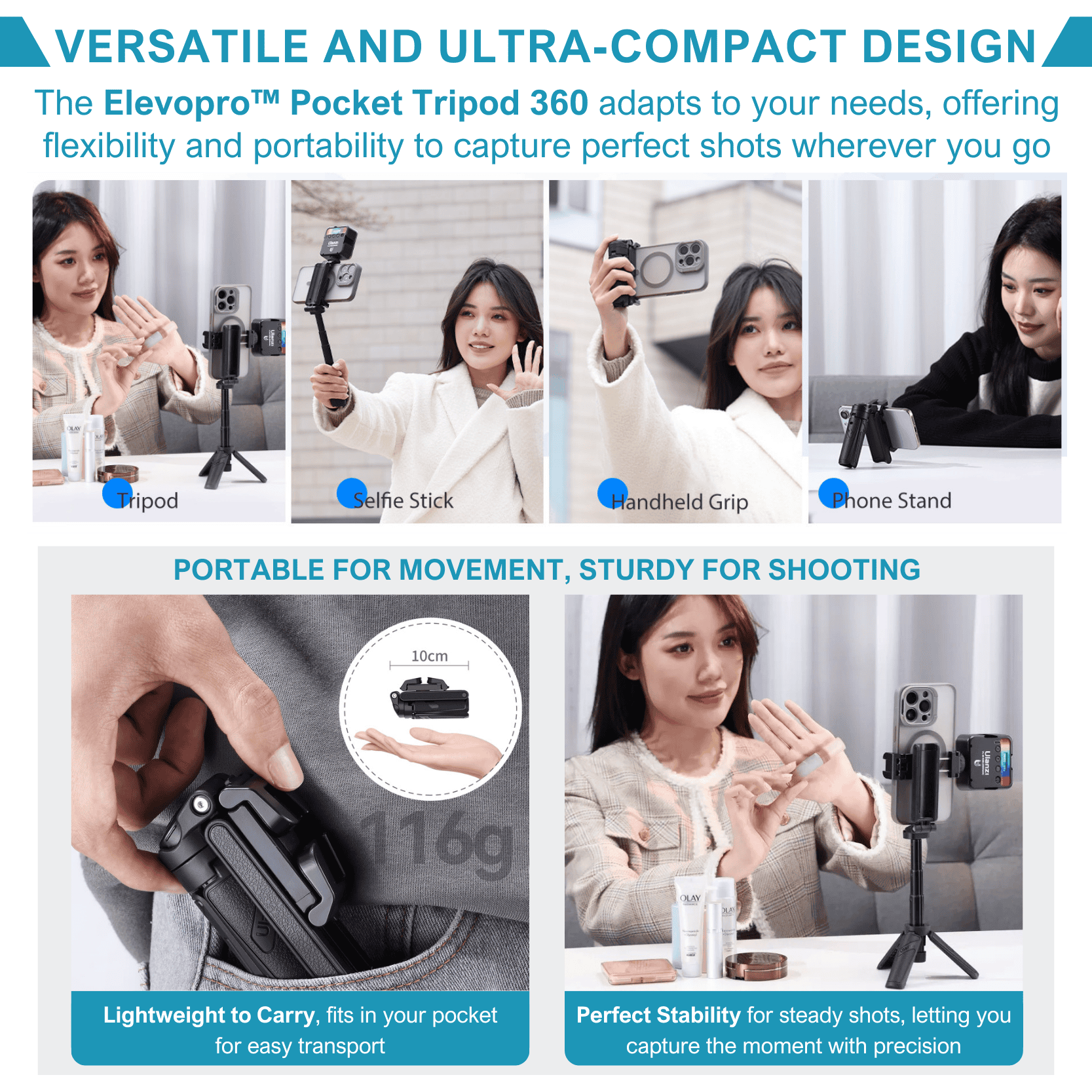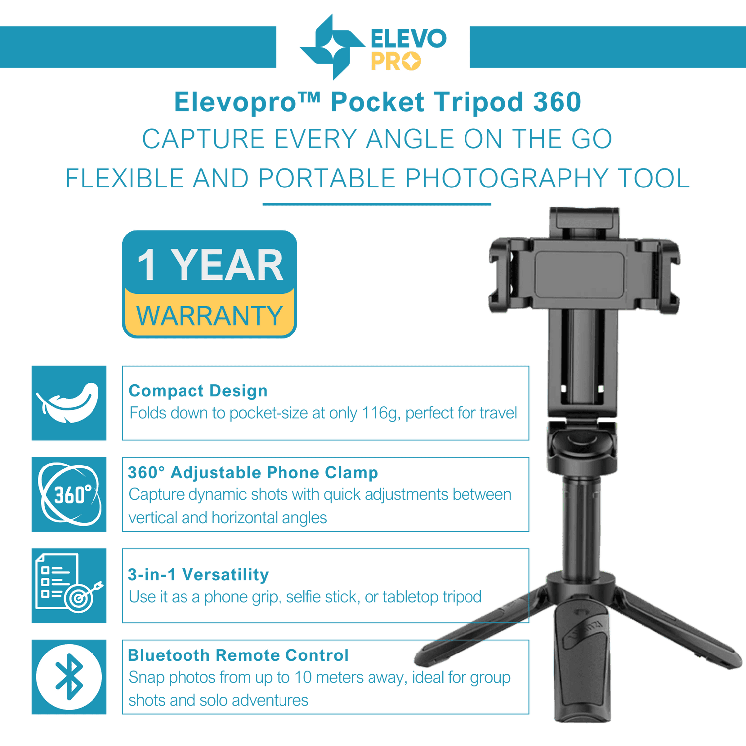 For every adventure and moment worth capturing, having the right gear is a must. Introducing the Elevopro™ Pocket Tripod 360, offering: