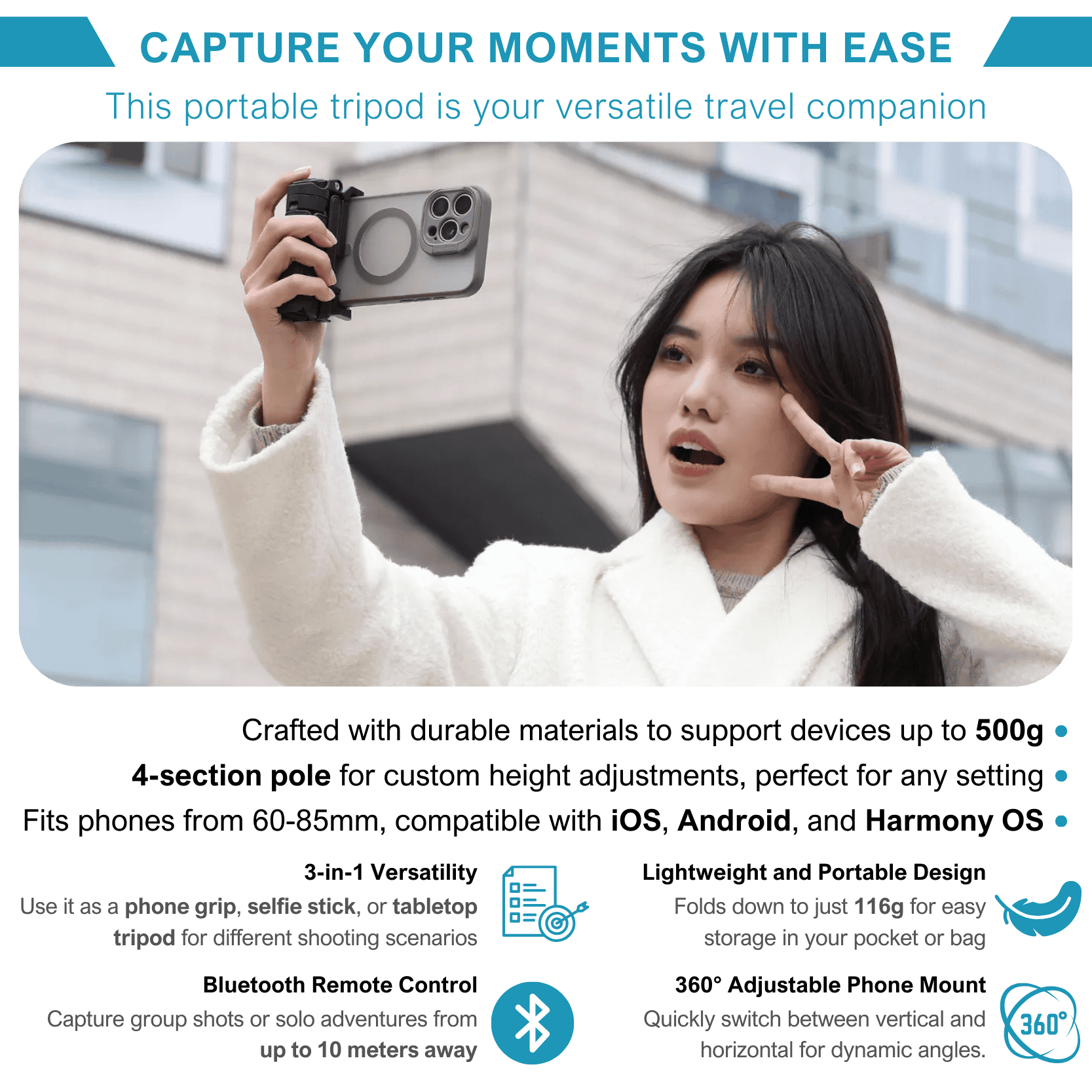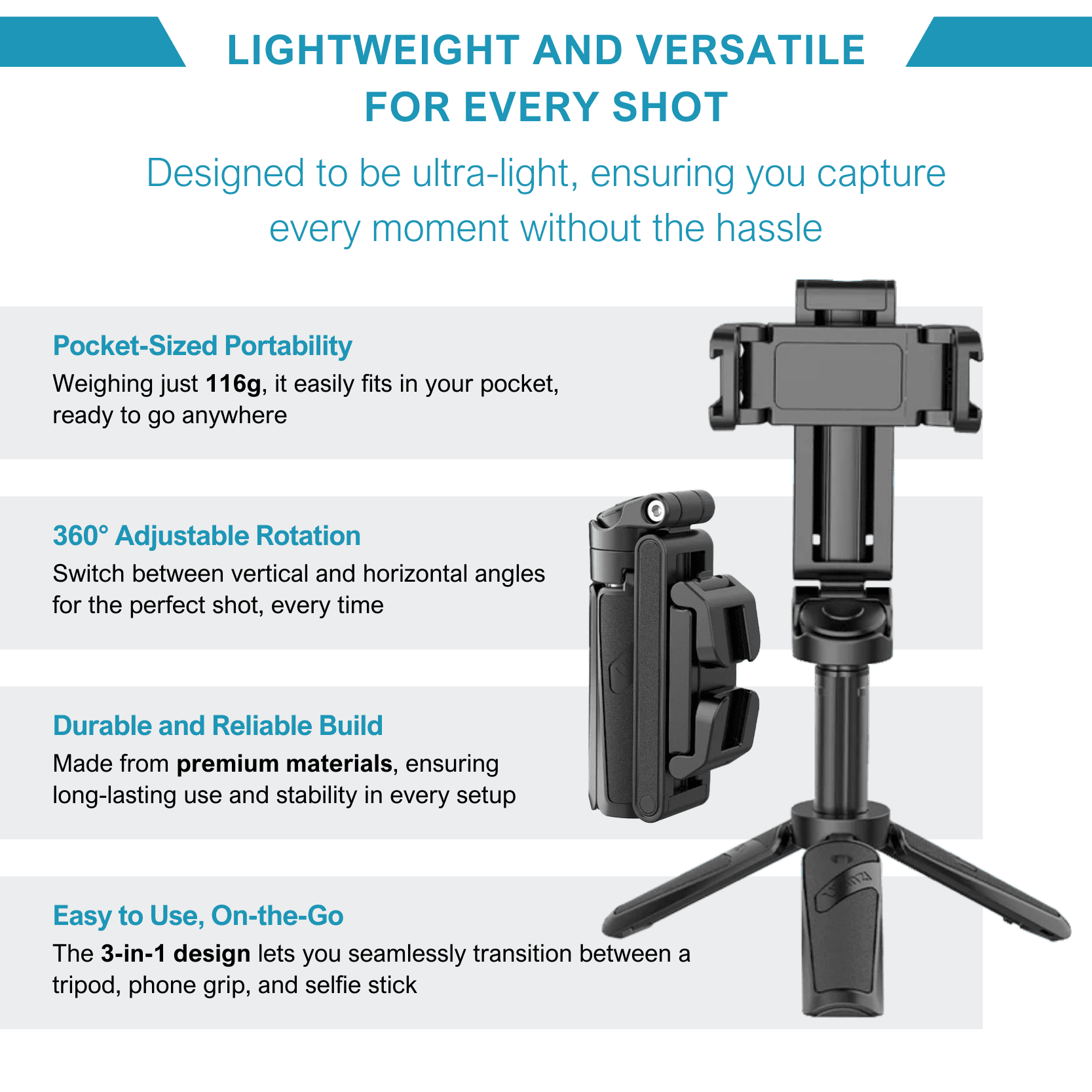 Use it as a phone grip, selfie stick, or tabletop tripod. This tripod offers 3-in-1 functionality, making it the ultimate tool for travelers, vloggers, and everyday users who need flexibility.