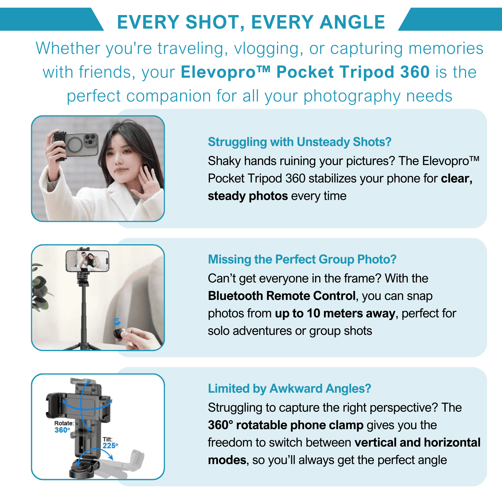 After years of innovation and testing, the Elevopro™ Pocket Tripod 360 sets a new standard in mobile photography. This compact, pocket-sized tripod delivers unmatched flexibility and portability. Users have reported significant improvements in capturing dynamic angles with the 360° rotatable mount and praised its 3-in-1 versatility for all shooting scenarios.