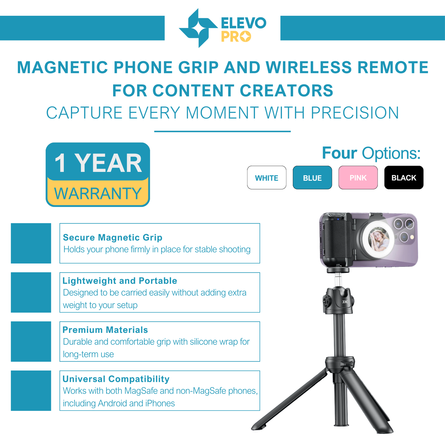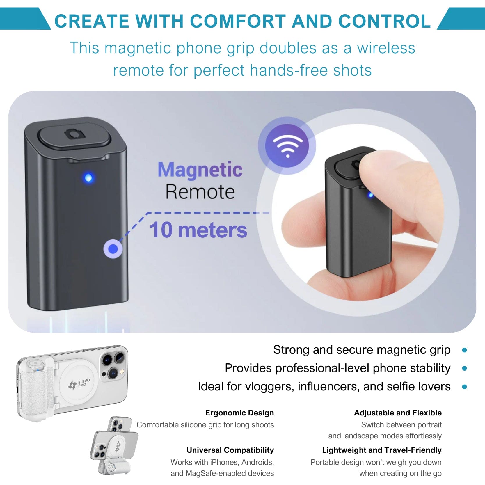 The Elevopro™ MagGrip Vlogger Pro is the ultimate tool for anyone passionate about capturing life's moments, whether you're a seasoned traveler, an outdoor enthusiast, a photography lover, or a dedicated content creator. Designed with versatility in mind, this magnetic phone grip offers a secure hold that ensures your phone stays in place, no matter where your adventures take you. The lightweight and portable design makes it easy to carry, so you're always ready to capture that perfect shot. With universal compatibility, it works seamlessly with both MagSafe and non-MagSafe devices, making it ideal for any smartphone user. The detachable wireless remote adds convenience, allowing you to take hands-free photos or videos from up to 32.8 feet away. Whether you're exploring new destinations, documenting outdoor activities, or creating content on the go, the Elevopro™ MagGrip Vlogger Pro is your go-to accessory for capturing every moment with precision and ease.