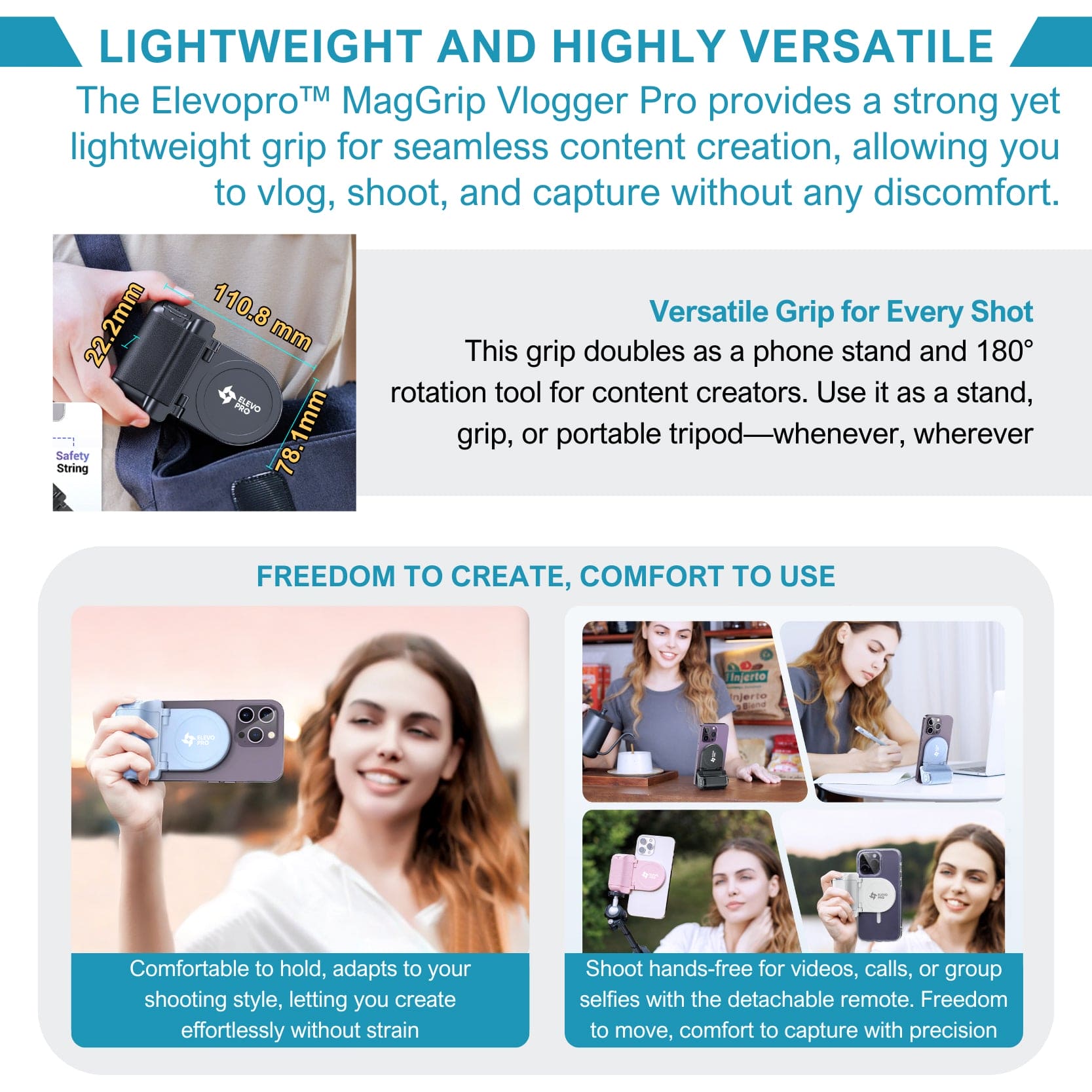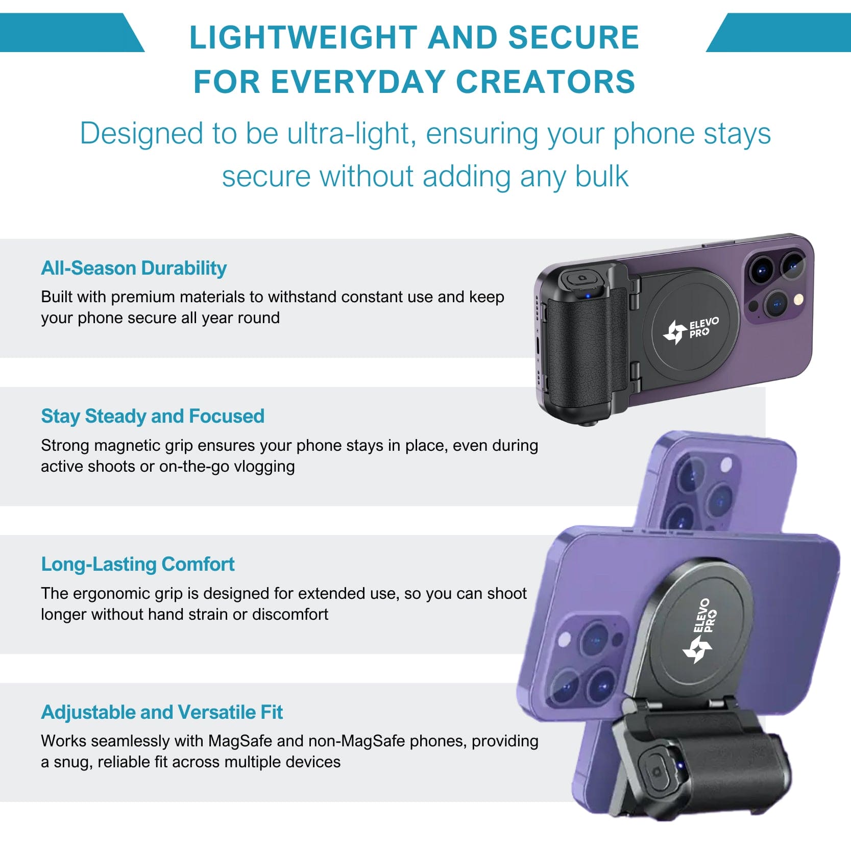 After years of meticulous development, the Elevopro™ MagGrip Vlogger Pro has proven to deliver unmatched stability and convenience. Users consistently report a dramatic improvement in content creation, from seamless hands-free control to secure, steady shots in any environment. With its universal compatibility and ergonomic design, the Elevopro™ MagGrip Vlogger Pro redefines what's possible for creators on the go. These features highlight the product’s superior design and functionality, setting a new standard for mobile photography and videography. Elevate your content creation today